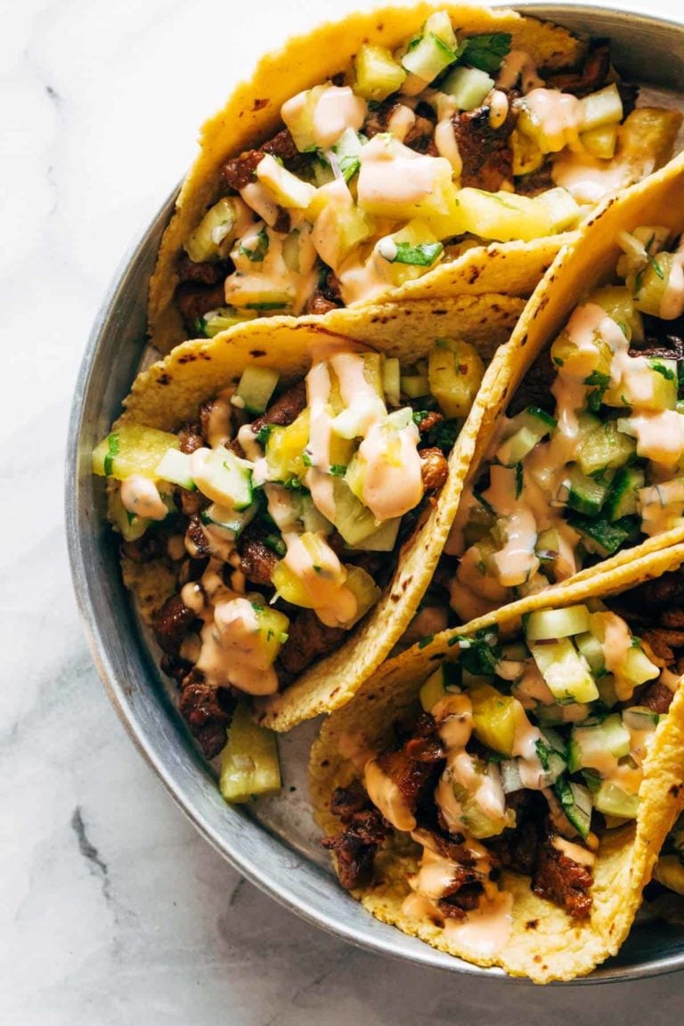 Let’s make pork tacos topped with sriracha mayo, obviously! Quick and easy to make with the best fruity pineapple salsa to boot.
