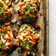 These loaded BBQ baked potatoes are filled with a creamy garlic herb spinach and potato mixture and then loaded with BBQ chicken, caramelized little pan roasted mushrooms, bleu cheese crumbles, crispy onions, and chives. Ho-lee-smokes. Crunchy. Saucy. Creamy, tangy, sweet. So filling. The flavors, the textures… if a minimalist baked potato is your dream, you may have to look elsewhere. This one is more of a maximalist situation for those of us who like their baked potatoes to go big, messy, and borderline excessive.